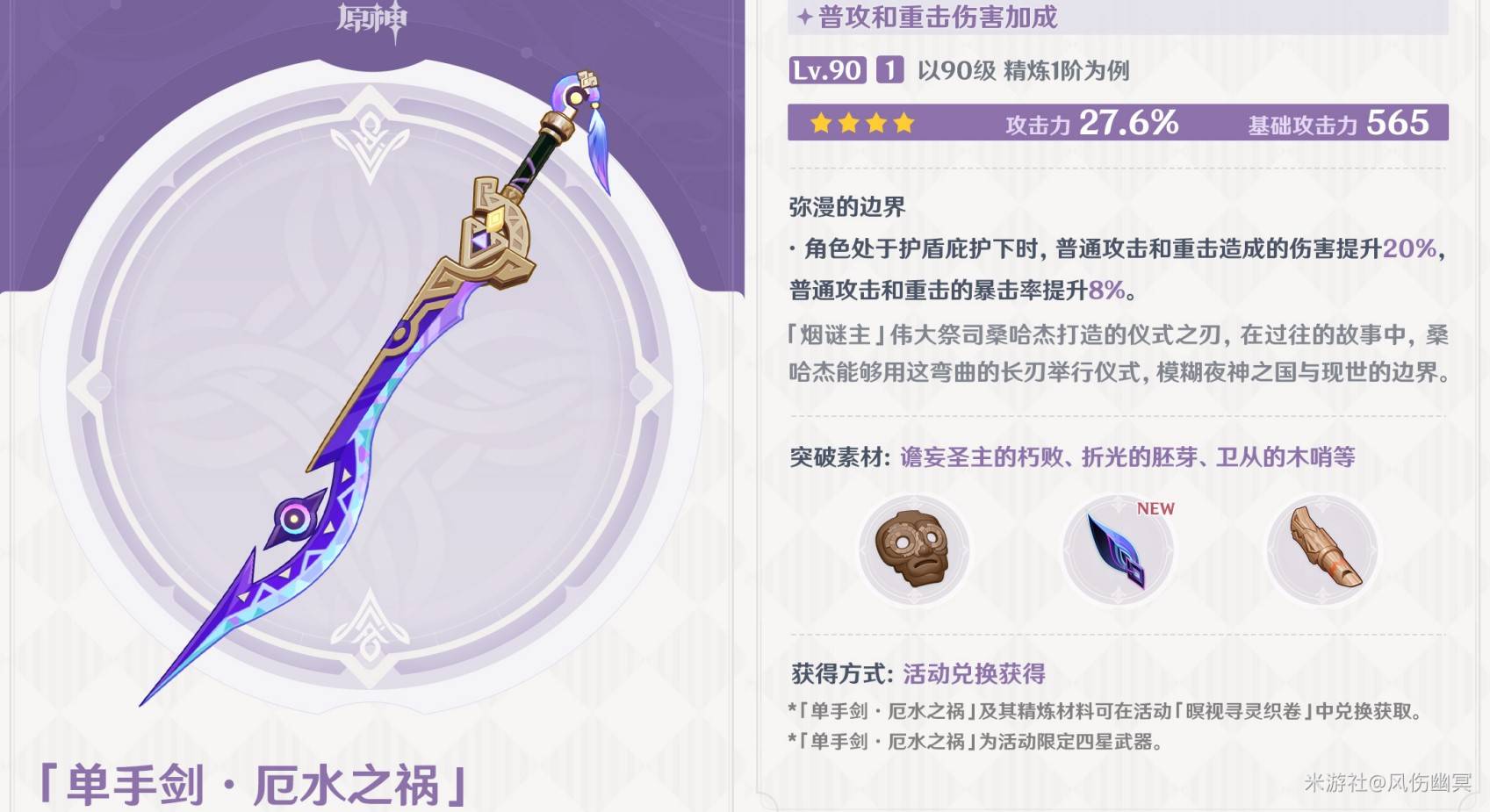 活动免费获取的单手剑,需要护盾,提升普攻和重击伤害,适合新玩家。