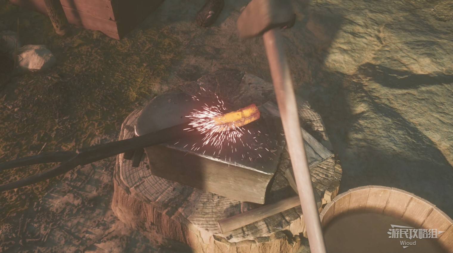 在与父亲的互动中,玩家需要通过摇晃手柄用锤子打铁,锤弯后翻面继续锤打,若铁块温度较低,则需放入火炉加热。