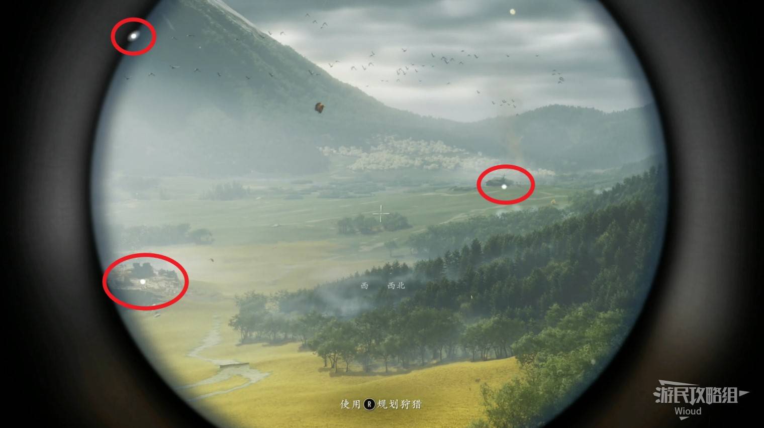 战斗结束后,画面切换至羊蹄山区域,玩家需要走到悬崖边使用望远镜,标记出三个重要地点,如下图所示。