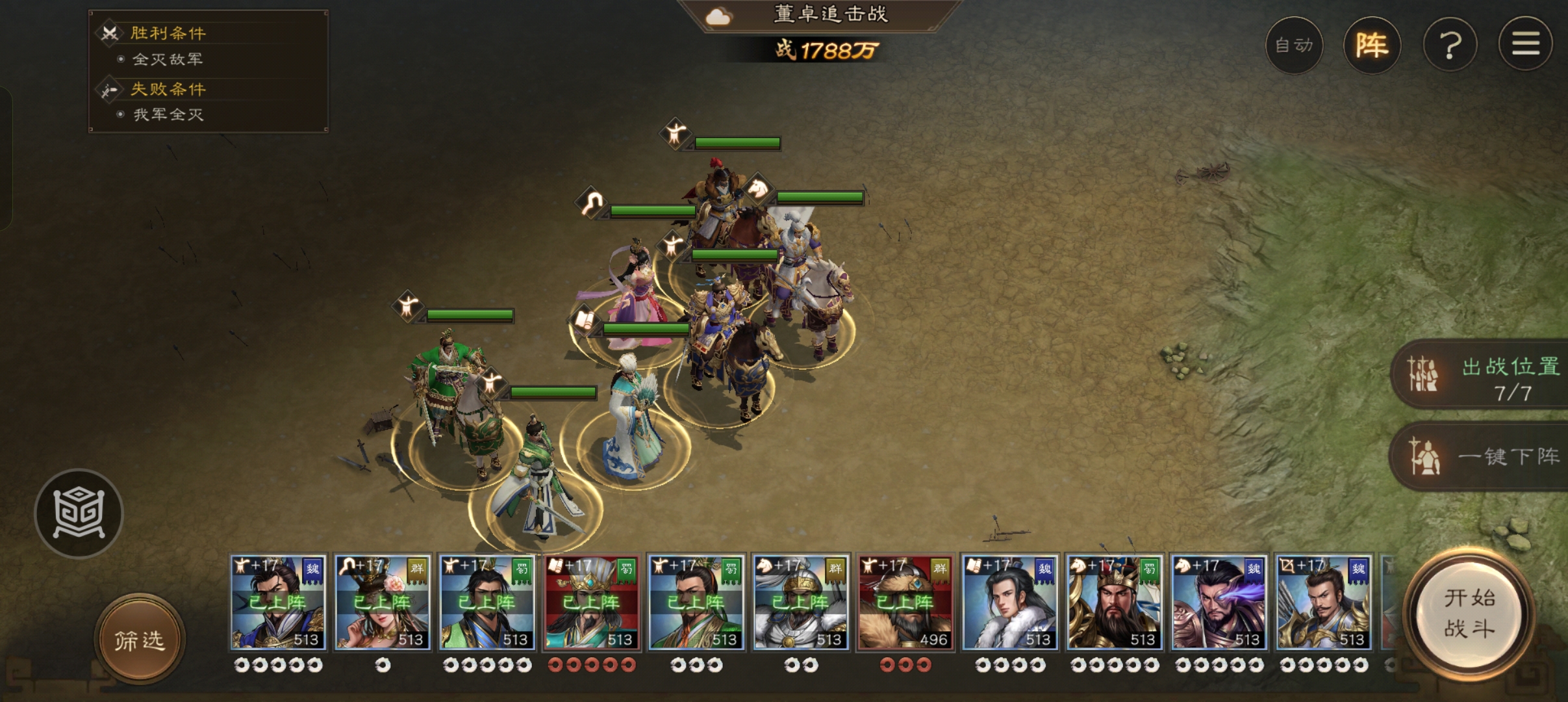 如果追求极限分数,建议准备一些存档加载(SL)。理论上可以在一回合内过关。出场人物如图所示。四人加完buff后,诸葛亮移动到最大距离释放风,如果运气好,李儒三人全死,刘备和徐庶再补刀剩下的小兵,否则继续SL。