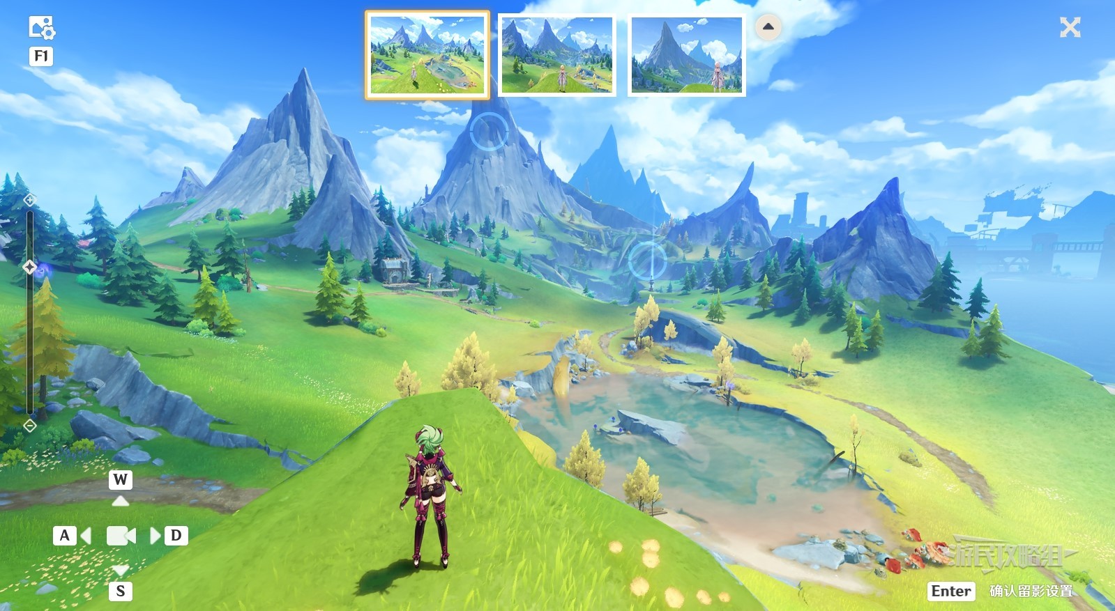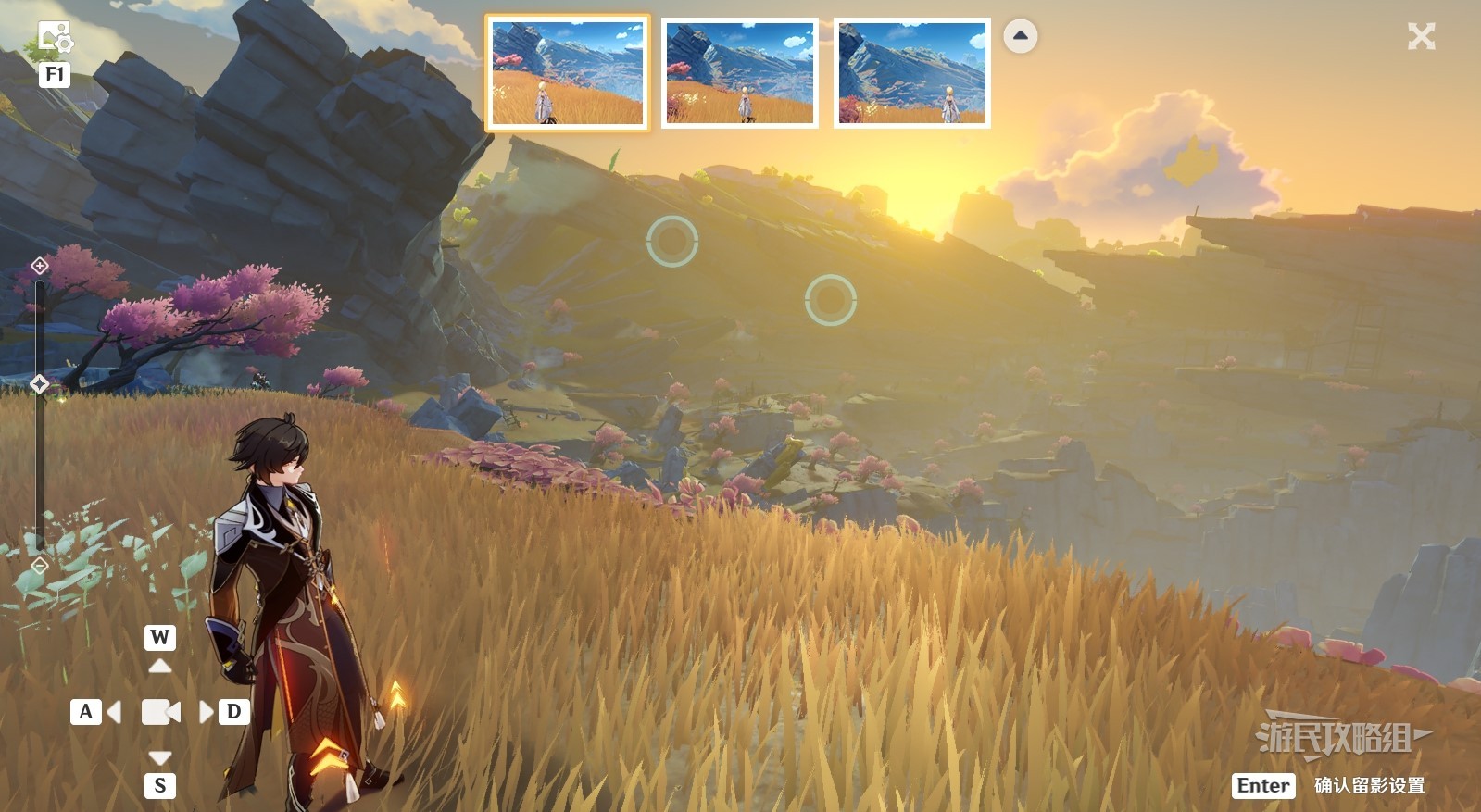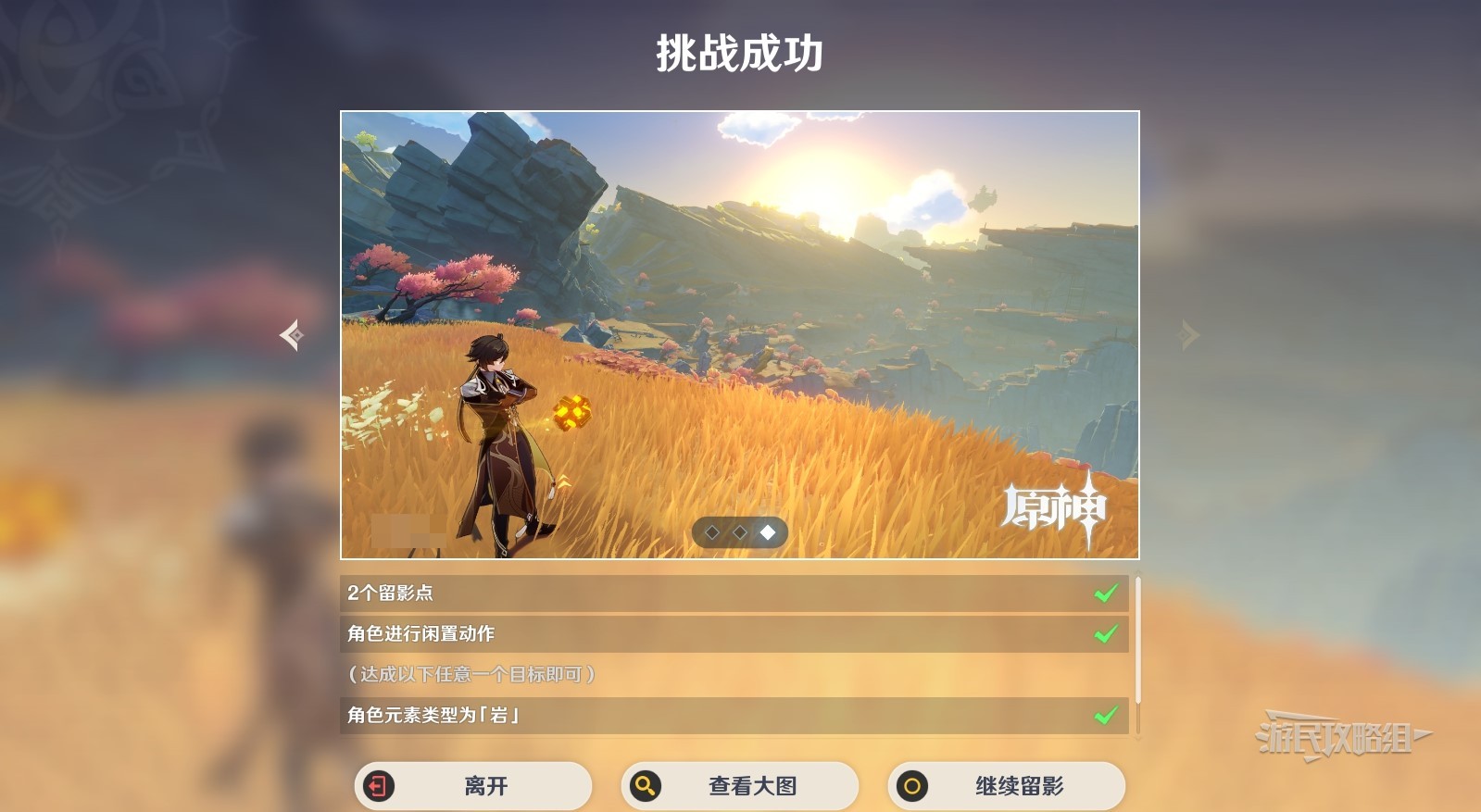 建议选择钟离或云堇(满足条件之一:选择任意岩元素角色,选择任意使用长柄武器的角色),将所有圆点保持在镜头内,可点击上方三种角度,然后点击右下角保存留影设置。
