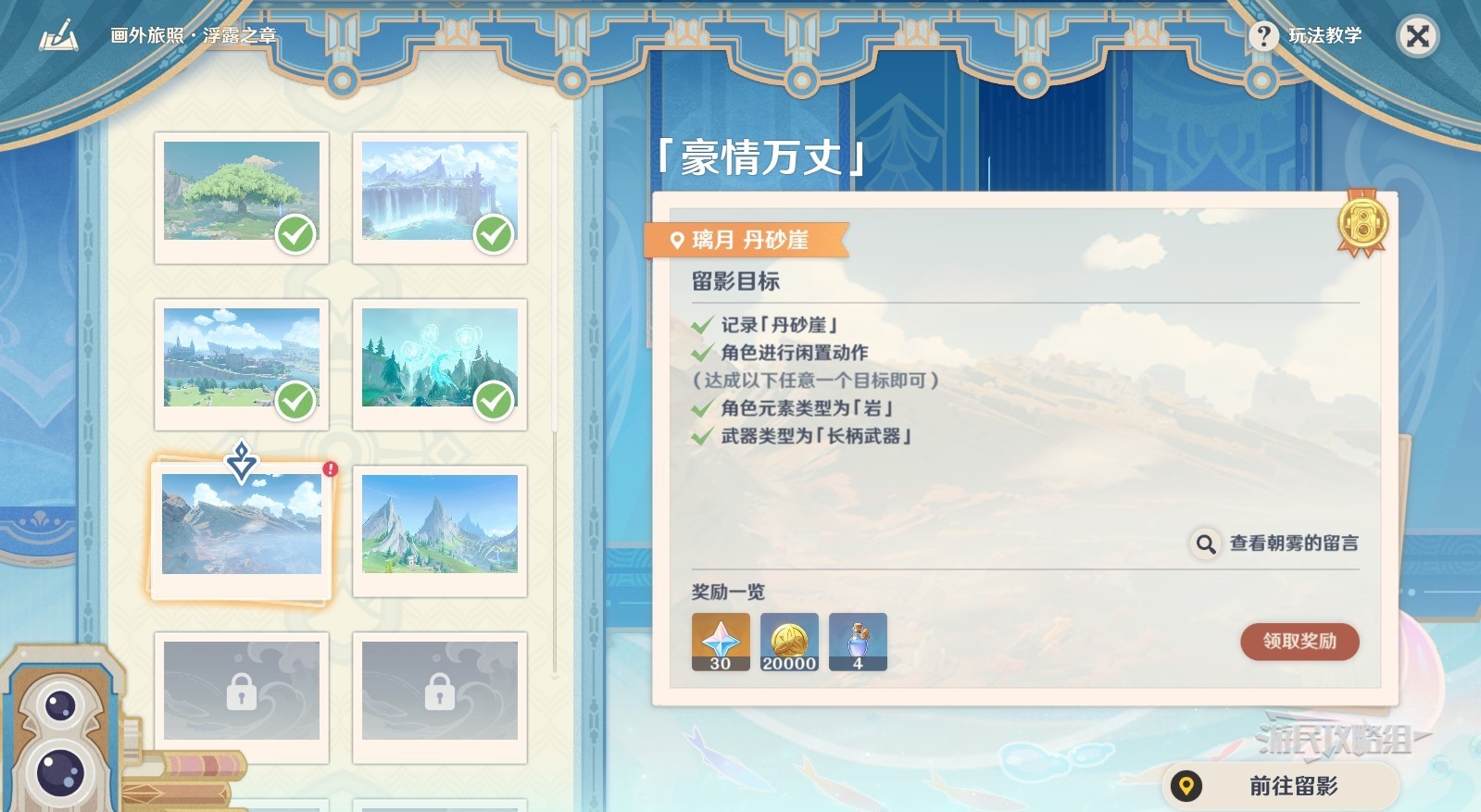 《原神》4.8版本推出“画外旅照浮露之章”活动,玩家需使用专用相机在指定位置拍照并满足摄影条件。以下是《原神》4.8画外旅照第三天满奖攻略,希望对大家有所帮助。