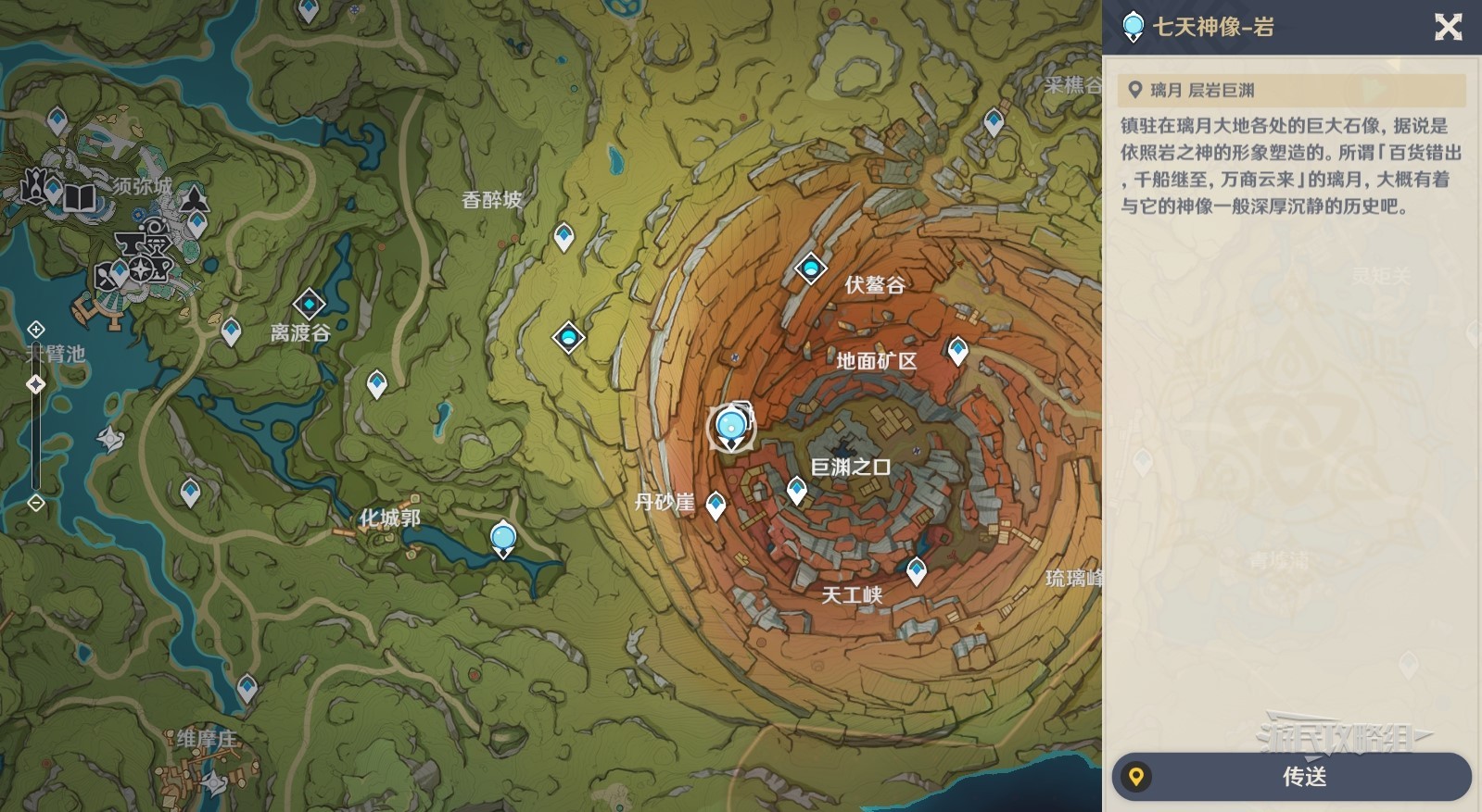 第五关位于璃月层岩巨渊丹砂崖,可直接传送到七天神像,前往拍照位置即可。
