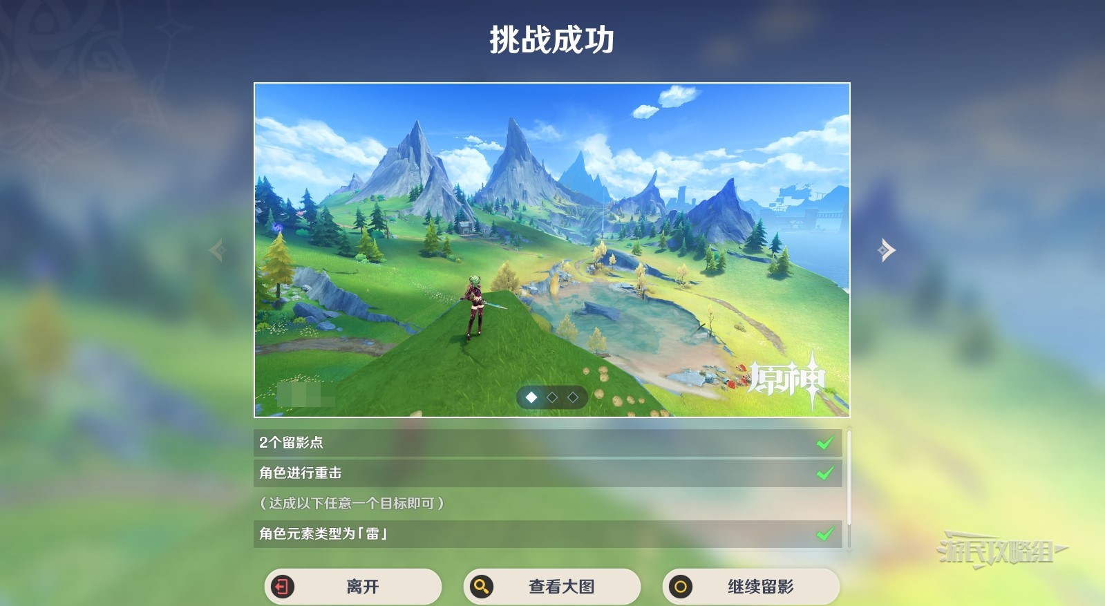 建议选择久岐忍或刻晴(满足条件之一:选择任意雷元素角色,选择任意使用单手剑的角色),将所有圆点保持在镜头内,可点击上方三种角度,然后点击右下角保存留影设置。