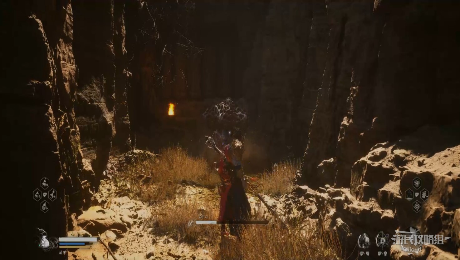 由于石中人身处一个狭窄的隧道中且体型较大,因此建议直接离远开始蓄力棍势,蓄满后走到石中人的位置攻击他,再离远蓄力慢慢将其耗死。