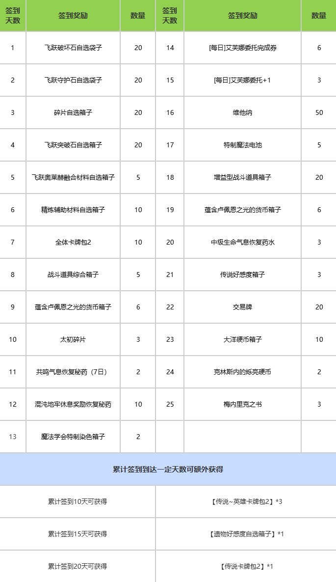 签到达到一定次数可领取不同道具奖励,包括装备材料、染色箱子、传说卡牌包等。