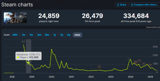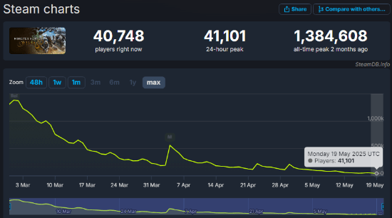 根据SteamDB的数据显示,到5月19日,《荒野》的在线峰值仅为41,101人,较首发周的1,384,608人骤降了97%。而对比之下,《怪物猎人 世界》在2018年发售后,同期(3个月)玩家数的下滑约为64%。即便如此,至今仍有超过2.6万名玩家在活跃。