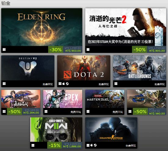 里面最畅销游戏中:《艾尔登法环》《命运2》《Dota2》《永劫无间》《Apex英雄》《CS:GO》《PUBG》《消逝的光芒2》《COD19》《游戏王:Master Duel》《怪物猎人:崛起》得到白金荣誉奖。